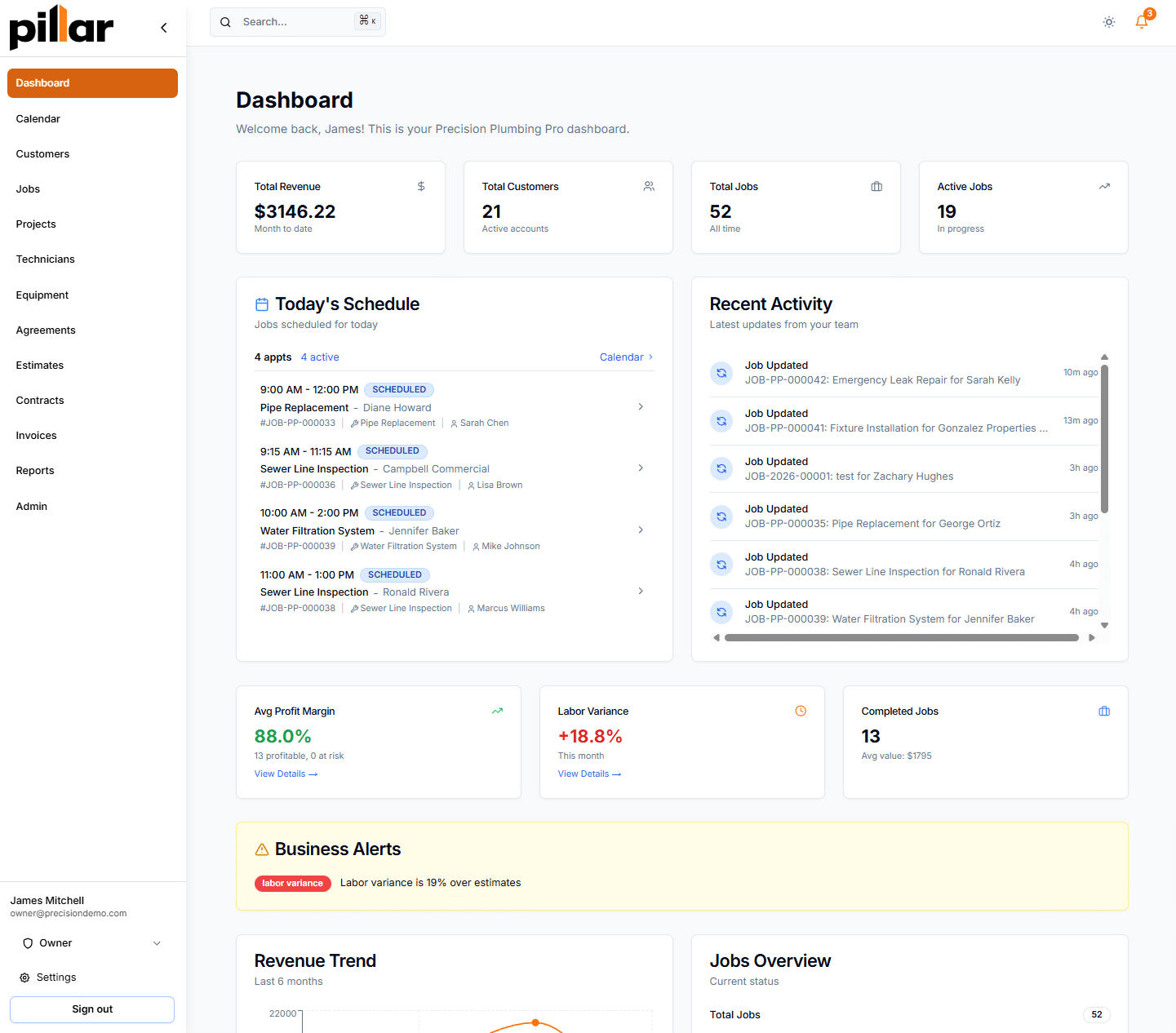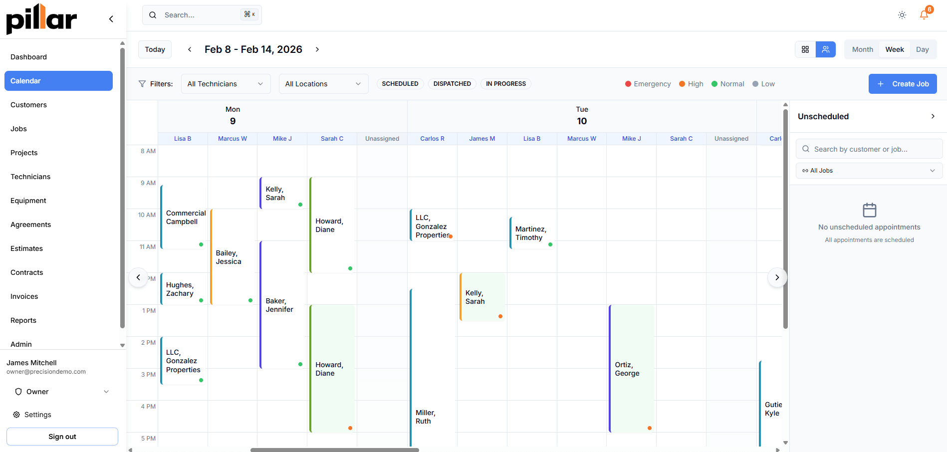 Pillar's drag-and-drop calendar shows conflicts before they happen. Month, week, and day views with color-coded technicians and an unscheduled jobs sidebar so nothing slips through.