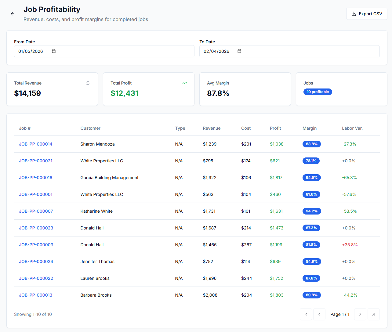 Profitability reports break down revenue, labor costs, and margins for every job. Spot underpriced services, track technician performance, and export everything to CSV.