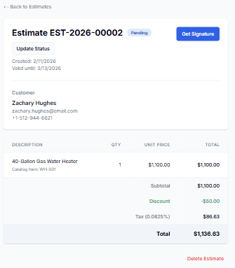 Professional estimates from your price book. Customers approve via e-signature — no login required.