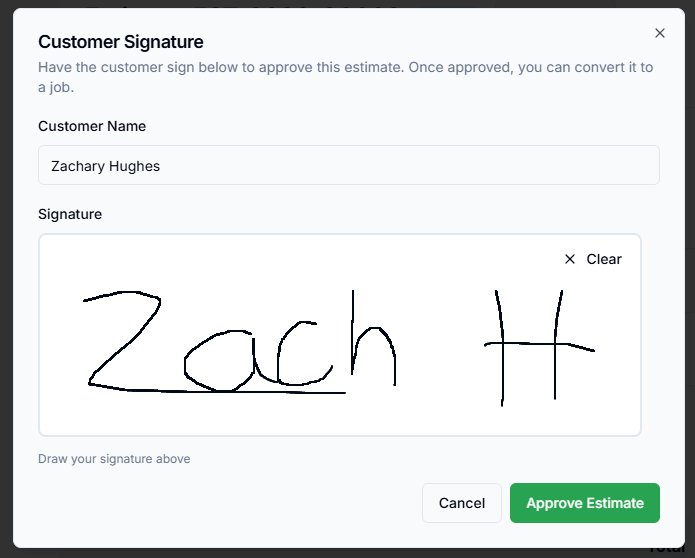 Customer signs right on the screen. The approved estimate converts to a job automatically — no re-entry, no delays.