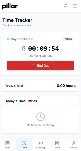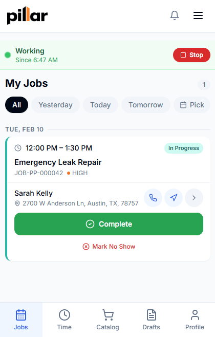 Pillar is a Progressive Web App — installable on any phone or tablet, no app store required. Technicians see their daily schedule, update job status, and capture signatures from the field.