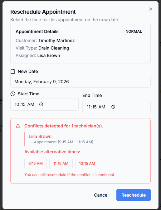 Through the customer portal, your customers view their upcoming appointments and submit a reschedule request in under a minute. They pick up to three preferred dates, select a reason, and your team takes it from there.