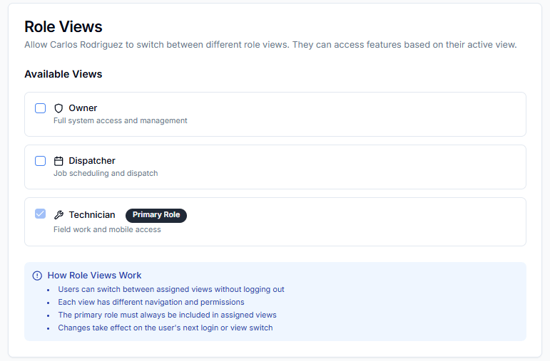 Every API endpoint is protected by role decorators. Owners see everything. Dispatchers manage operations. Technicians see their jobs. Customers see only their own data.