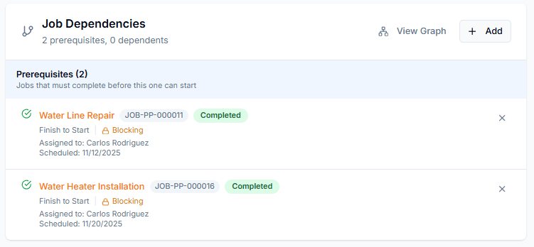 Define prerequisite relationships between jobs — finish-to-start, start-to-start, and more. Essential for complex, multi-phase work.