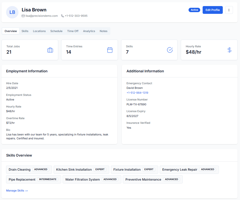 Track skill proficiency from Basic through Expert. The system recommends technicians based on skills and availability for each job.