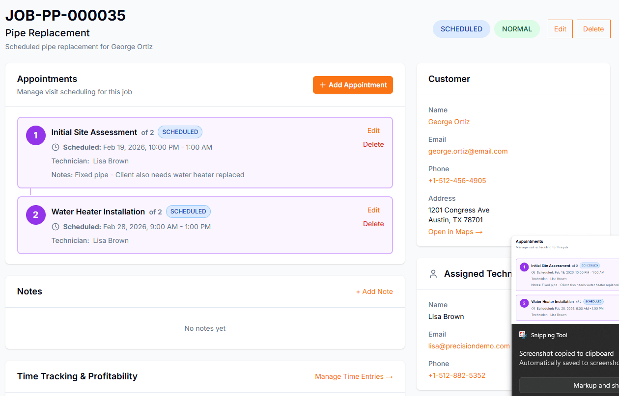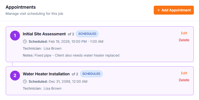 A system replacement is not a single appointment. Multi-visit jobs let you schedule sequential visits under one work order with separate checklists and technician assignments.